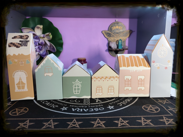 Ce calendrier est un village de Noël que vous pourrez mettre au pied du sapin . À l'intérieur vous y trouverez de nombreux produits de la boutique et créations faite main . Vous aurez 4 maisons de chaque designe