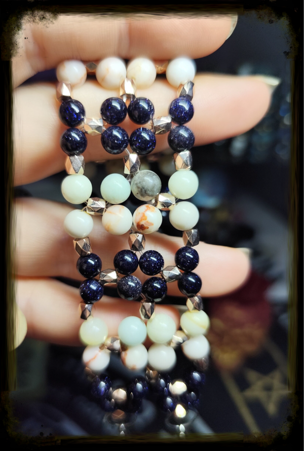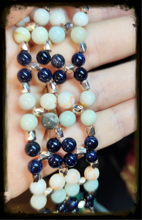 Laissez-vous charmer par notre bracelet "Étoile Céleste ", une création unique alliant l'éclat du Bleu de Sable Étoilé à la douceur du Jaspe Netstone et aux nuances apaisantes de l'Amazonite Multi. De petites perles facettées ovales viennent sublimer l'ensemble, ajoutant une touche de raffinement.
