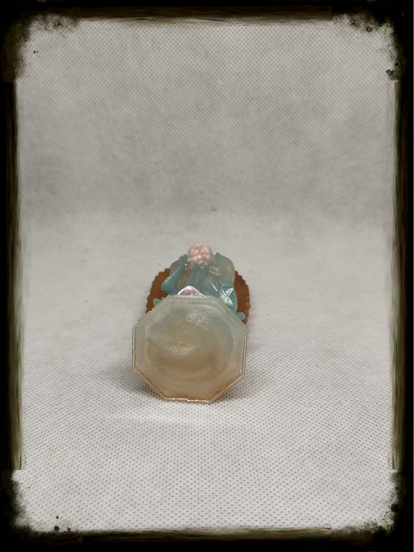 La statuette est sublimée par une auréole dorée qui irradie de la tête aux pieds de la Vierge, symbolisant sa sainteté et sa lumière. Les couleurs dominantes sont choisies avec soin pour évoquer la pureté et la douceur : un bleu ciel clair pour les drapés, reflétant la sérénité céleste, et un rose délicat pour les chairs, apportant une touche de chaleur et d'humanité. Le doré, omniprésent, accentue la sacralité et la préciosité de cette représentation.