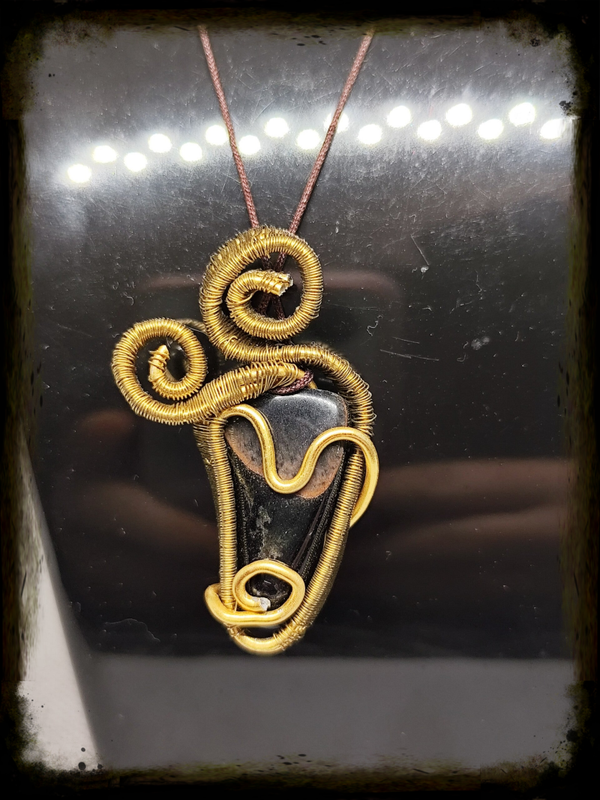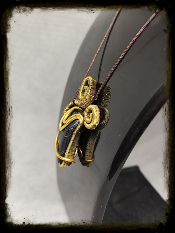 Découvrez une pièce unique façonnée entièrement à la main : ce pendentif associe la puissance du véritable Œil de Faucon à l'élégance du fil de laiton doré travaillé selon la technique du wire wrapping (enroulage de fil).