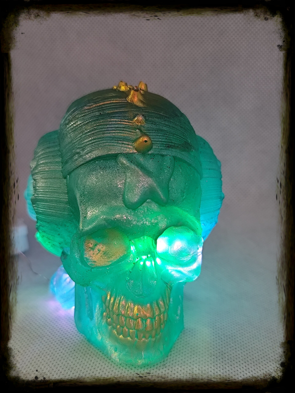 Design Envoûtant : Le crâne est coiffé d'un turban sculpté orné de perles dorées, lui conférant une personnalité de guerrier ou de sultan mythique.