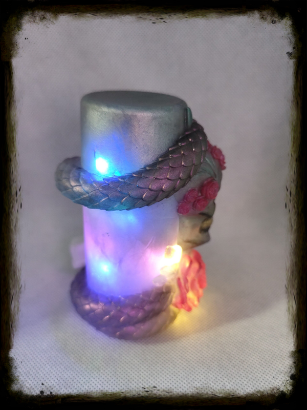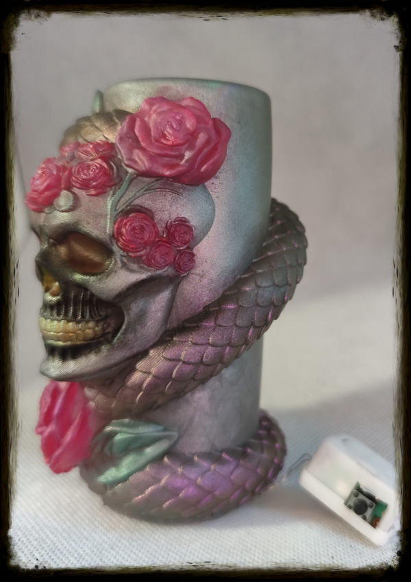 Effet Iridescent et Métallique : La résine est recouverte d'une finition chromatique changeante (irisée) de gris-argent à violet-mauve. Le crâne et le corps du serpent semblent faits d'un métal ancien, reflétant la lumière avec des teintes mystiques.